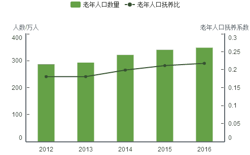 2012-2016北京市60岁以上老年人口数量与老年人口抚养比